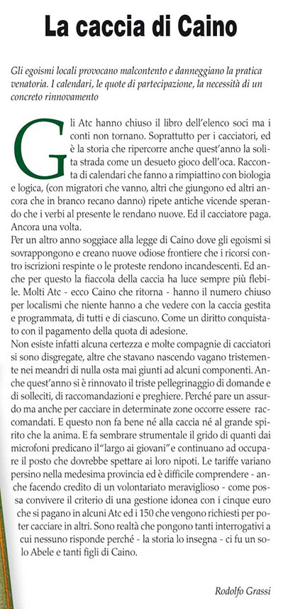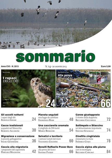Gli aspetti più interessanti della piccola galleggiatrice, l’alzavola, tanti individui inanellati ma pochi nidificanti; in attesa di ottobre, i preparativi del capanni sta, la manutenzione dell’appostamento e l’addestramento dei richiami; i camosci venuti al mare, la particolare popolazione del Carso; la prova sotto stress del nuovo Benelli Raffaello Power Bore. Per la cinofilia, le prove su quaglie di Campo Felice; la preparazione dei i continentali per la nuova stagione; betonista si diventa; mondo setter; Weimaraner Club Italia. Tanto altro inerente il mondo ella caccia e delle armi.